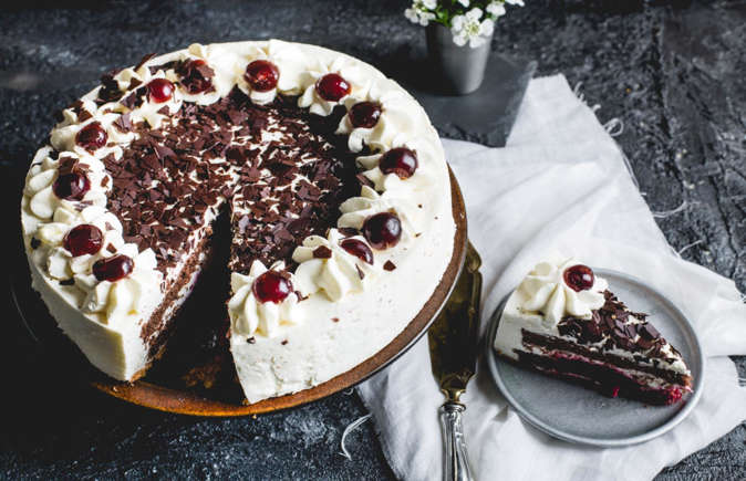 Escurre el almíbar de un tarro grande de cerezas y mezcla 6 cucharadas con 3 cucharadas de kirsch. Corta el bizcocho en tres capas horizontales. Rocía cada capa con el almíbar. Bate 475 ml de nata para montar con 3 cucharadas de azúcar glas. Decora el pastel con la nata, las cerezas y chocolate oscuro rallado.